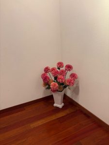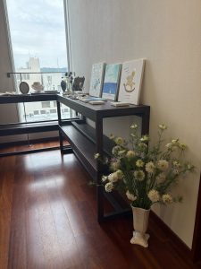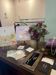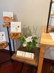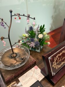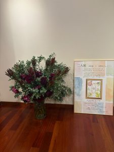 空間全体のバランスを意識しながら、花瓶への装花やポイントごとの演出を行い、来場者の皆様に心地よく感じていただける空間づくりをお手伝いさせていただきました。